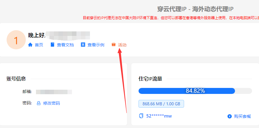 注册后30天内登录后台,点击“活动”按钮,领取包含试用积分和流量的新手试用礼包。