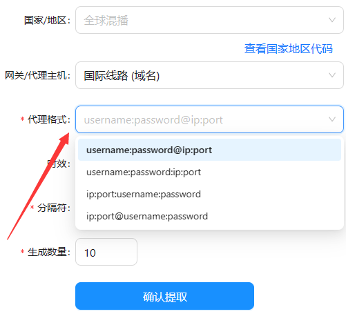 ip:port:username:password。 - 时效: 可按需求提取时长,注册养号建议选择长时效。