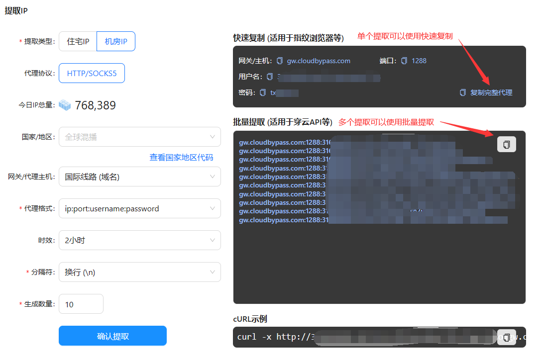 步骤1:提取穿云动态住宅代理或机房代理IP