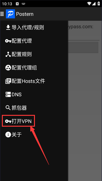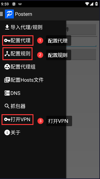 打开安卓手机上的 Postern 应用,点击左上角的“三条横杠”菜单图标,按以下顺序配置: