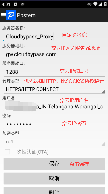 - 代理类型: 选择 HTTP/HTTPS Connect(建议首选此模式,在安卓环境下通常比 Socks5 更稳定)。