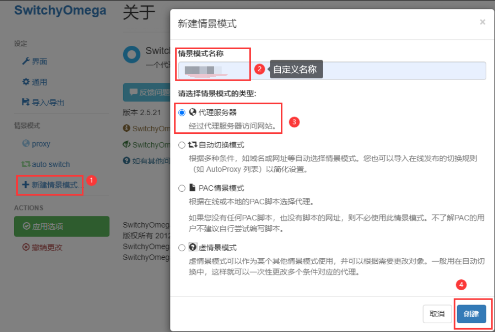 3. 在弹窗中填写 “情景模式名称”(例如:穿云代理),类型选择 “代理服务器”,然后点击 “创建”