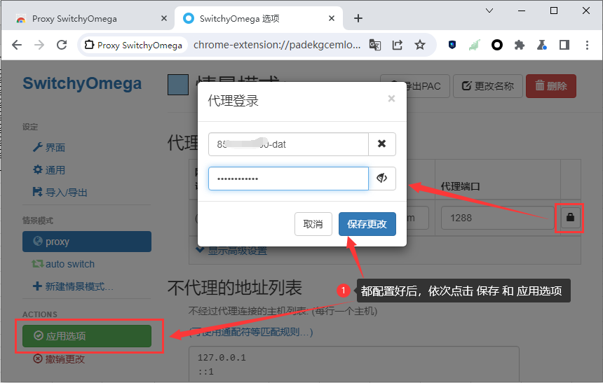 点击代理服务器行末尾的 “锁” 图标(认证详情),输入提取好的代理账号代理密码,点击 “保存”