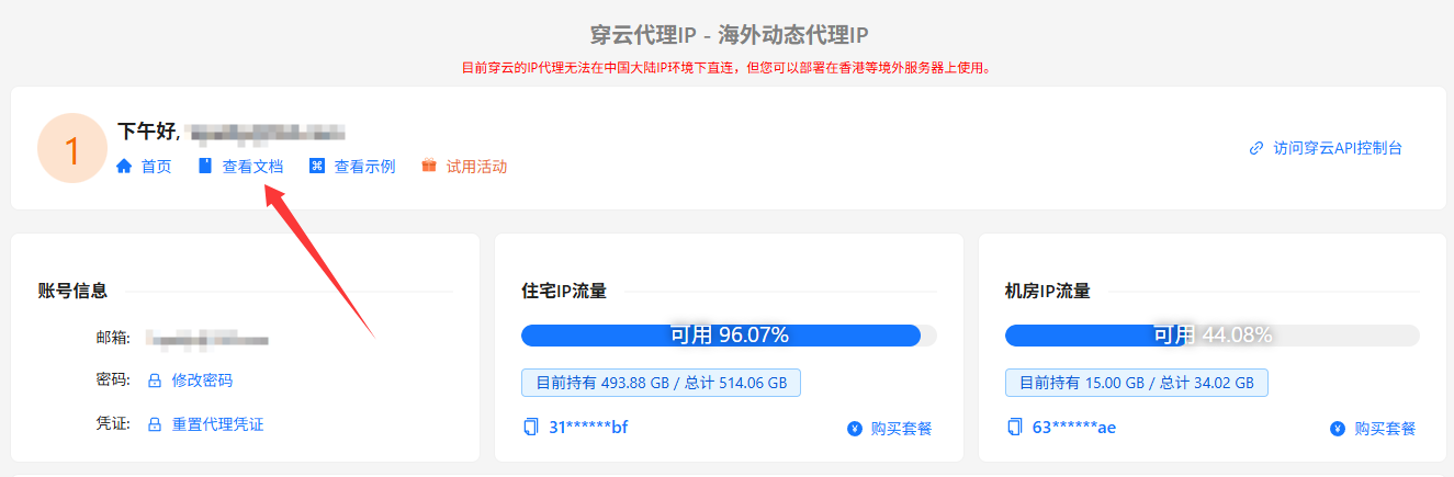 穿云代理在连接时需要提供代理凭证(用户名和密码)进行基础访问身份验证,您可以在流量信息卡片中点击加密串以快速复制用户名和密码。新用户需先开通对应的动态住宅代理或动态机房代理流量套餐方可操作。