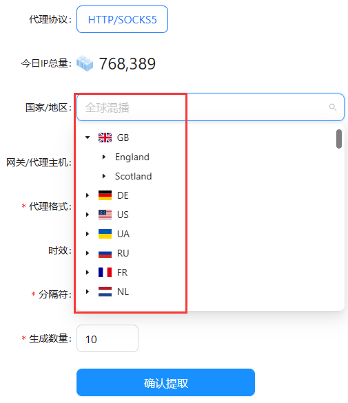 - 技术建议: 建议根据目标网站的地域限制选择特定国家提取,以提高连接成功率。默认的“全球混播”虽然覆盖广,但在某些特定业务中稳定性可能不如定向国家。