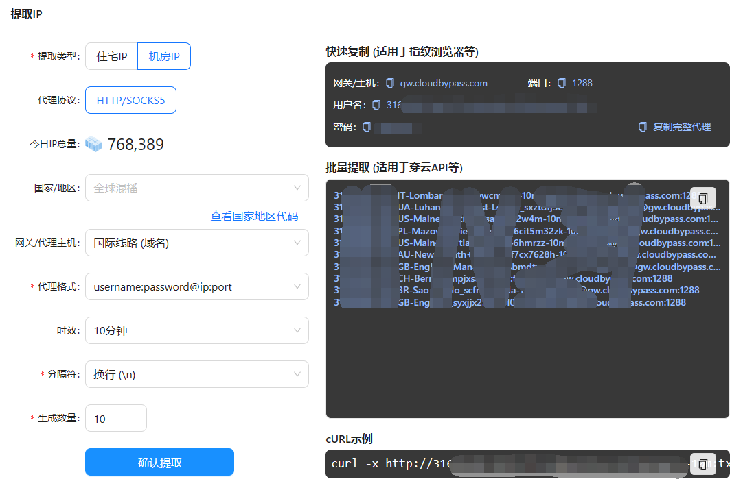 点击“提取”按钮,即可获得生成的代理信息。您可以将其快速集成至穿云 API,或配置到第三方爬虫、脚本及指纹浏览器中。