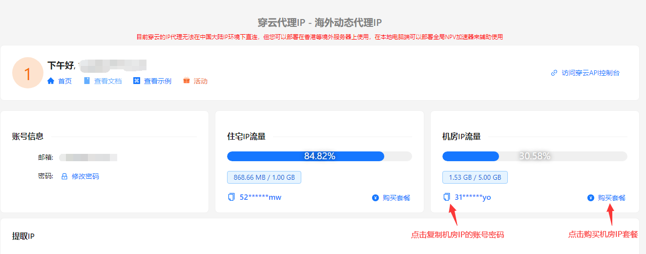 - 账密获取: 在后台点击“复制机房IP账号密码”即可一键获取认证凭据。