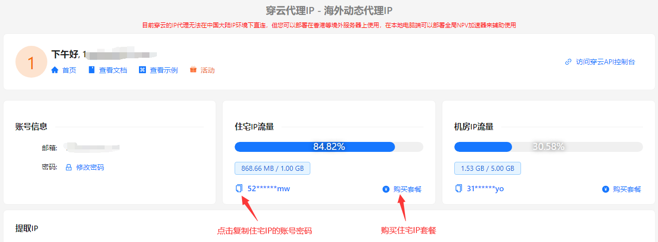点击“提取”按钮,即可获得生成的代理信息。您可以将其快速集成至穿云 API,或配置到第三方爬虫、脚本及指纹浏览器中。