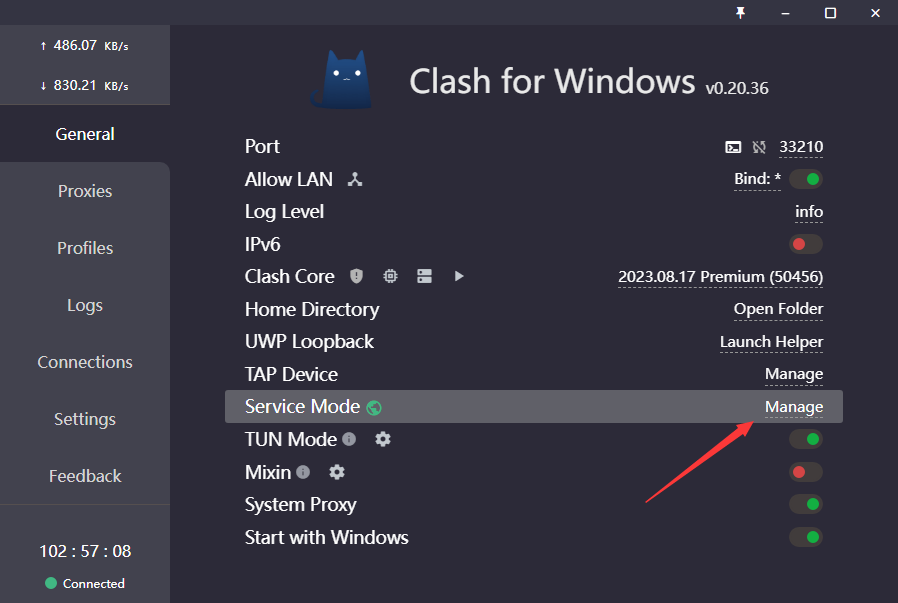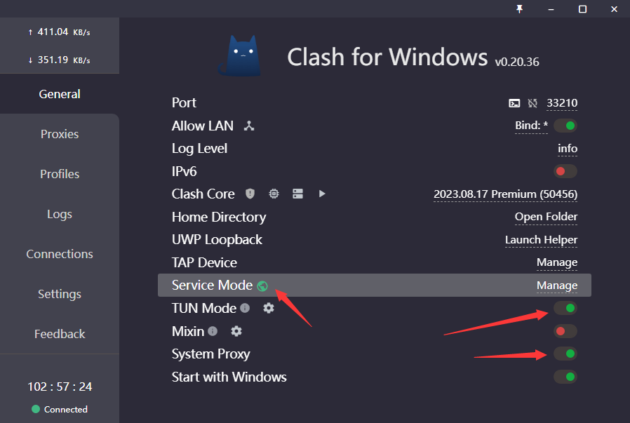在 General 界面,同时开启 TUN Mode 和 System Proxy 两个开关。