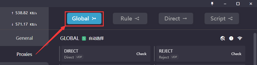 在 Proxies(代理)选项卡中,将顶部的运行模式切换为 Global(全局模式),并选择一个可用的境外节点。